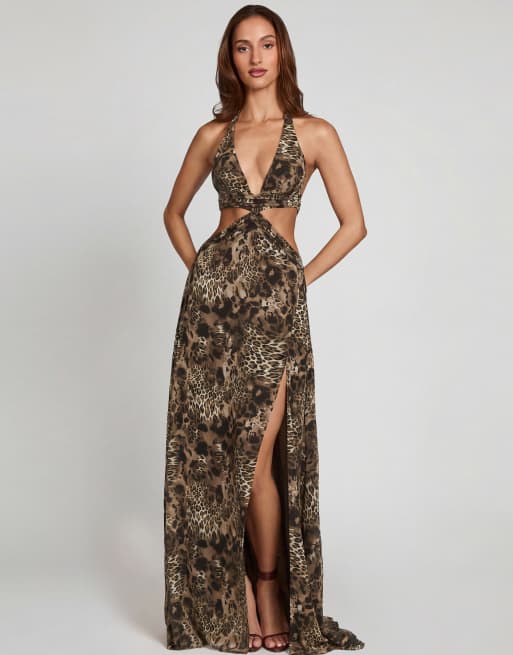 Oh Polly tie detail leg split maxi dress in leopard