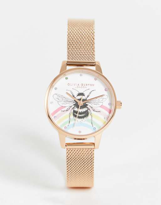 Olivia Burton rainbow bee mesh strap watch in rose gold