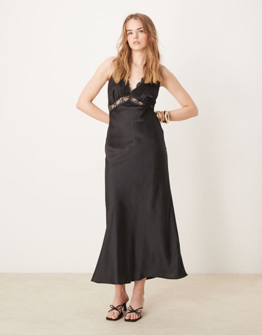 OMNES Aurelia Lace Trim Satin Maxi Dress in black