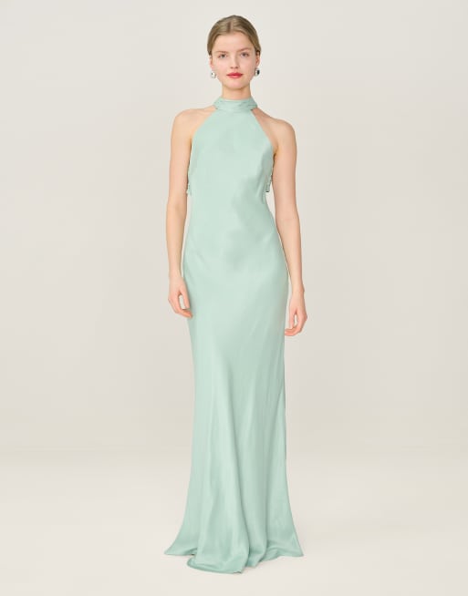 Omnes Dresses milos halterneck maxi dress with sash detail in sage green in green