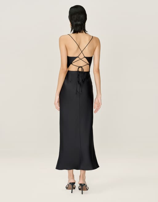 Omnes Dresses riviera black satin midi dress with lace-up back in black