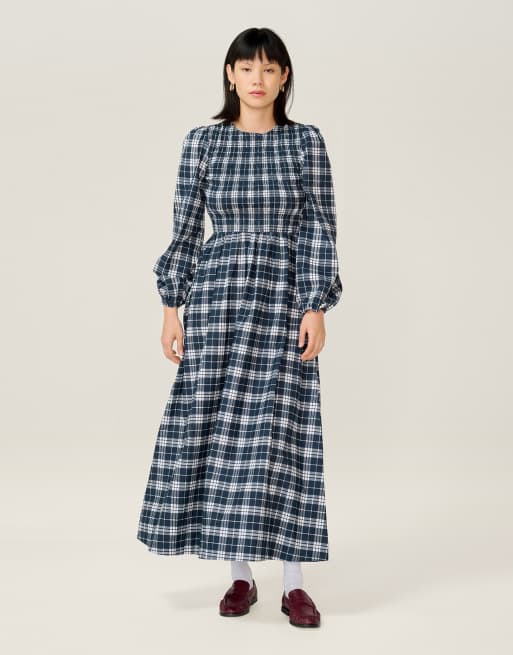 Omnes Dresses saint shirred bodice with baloon sleeve midi dress in navy check