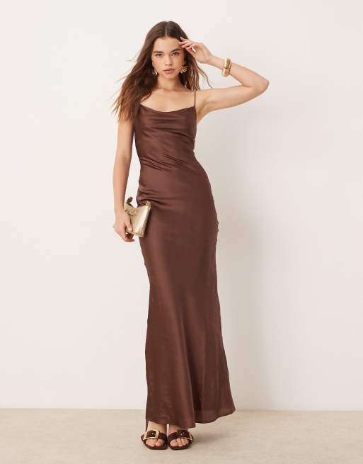 OMNES Ginny Maxi Strappy satin Slip Dress in Brown