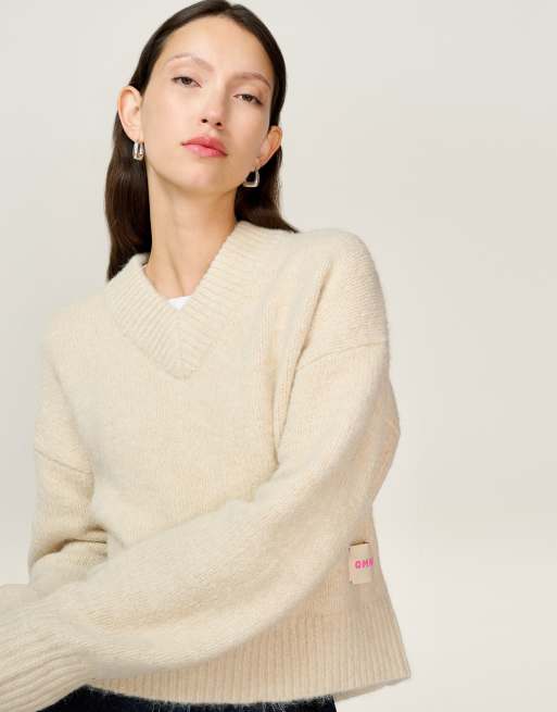 Omnes Knitwear premium daria v-neck thick knit boxy jumper in beige