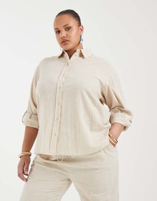 ONLY Curve 100% cotton long sleeve shirt co-ord in light beige
