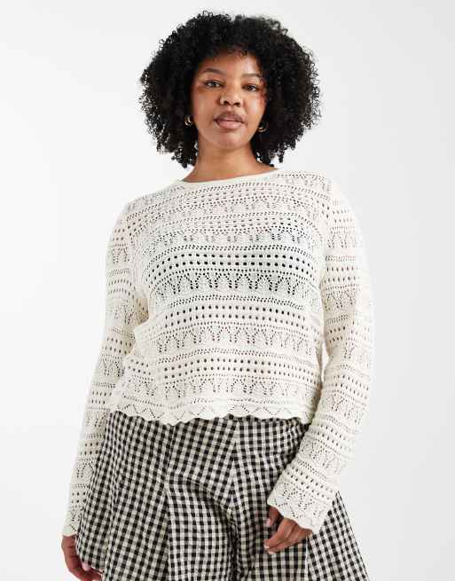 ONLY Curve long sleeve crochet top in cream