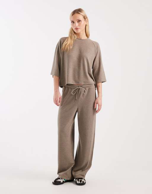 ONLY Petite soft texture boxy t-shirt and soft texture wide leg trouser co-ord in light brown