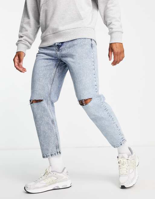 Only & Sons Avi tapered cropped jeans in light blue with knee rips
