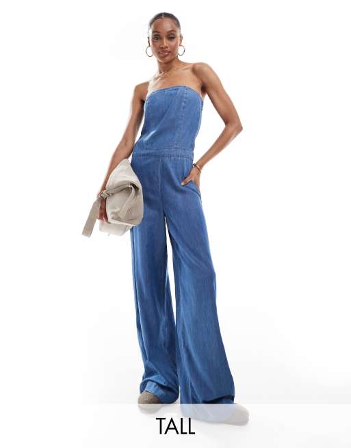 ONLY Tall bandaue wide leg denim jumpsuit in mid wash