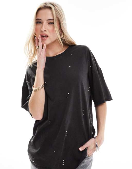 ONLY boxy fit t-shirt with rhinestone in washed black