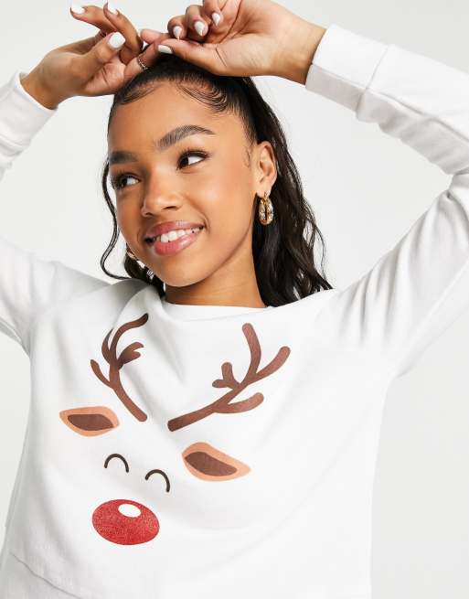 Only Christmas reindeer cropped sweatshirt in white