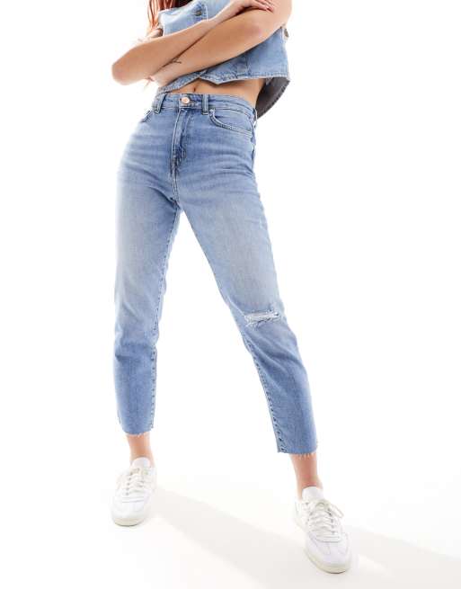 ONLY Emily high waisted straight leg distressed jeans in light blue