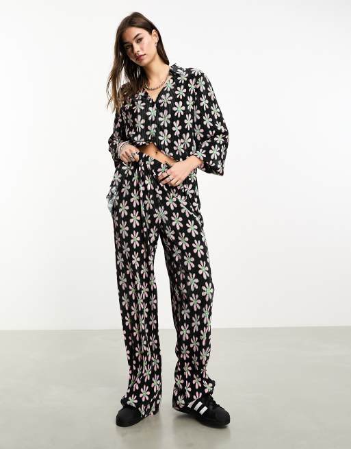 ONLY plisse wide leg trouser co-ord in black and pink daisy