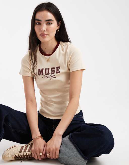 ONLY shrunken t-shirt with muse varsity print in cream and brown