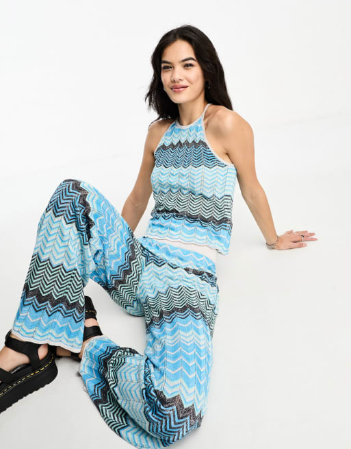 Only straight leg trousers and vest top co-ord in blue glitter chevron print