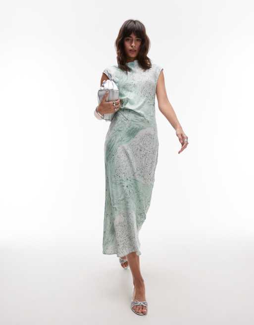 & Other Stories bias cut satin midi dress with drape detail in green oil print