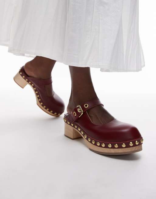 & Other Stories real leather wooden sole heeled clogs in dark red