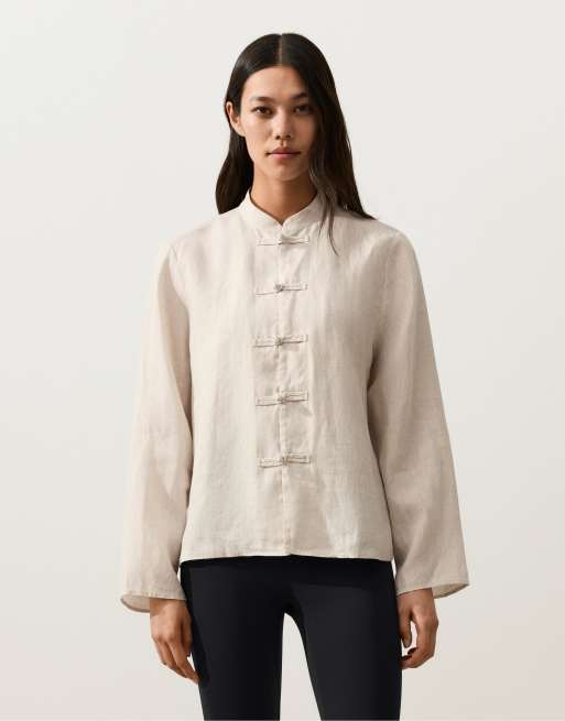 OYSHO 100% linen stand-up collar jacket with buttons in sand
