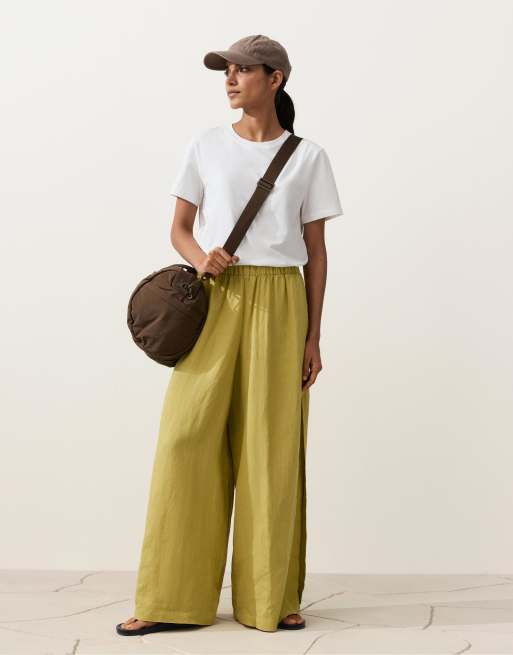 OYSHO 100% linen wide-leg trousers with side pleat in lime green