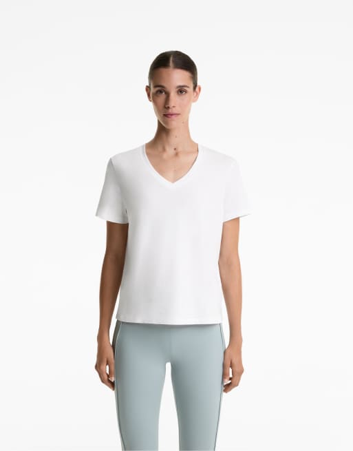 OYSHO Cotton blend v-neck t-shirt in off-white