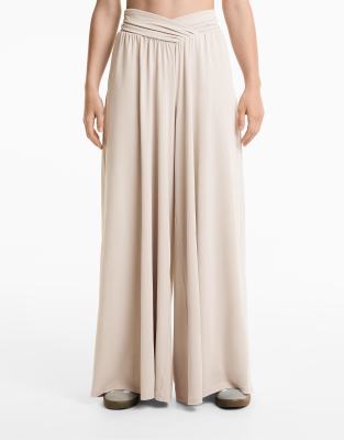 OYSHO Extra wide v-cut waist floaty trousers with modal in pale mink