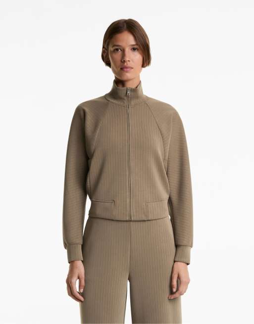 OYSHO High-collar striped jacket with soft-touch modal in mocha