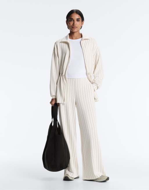 OYSHO Long pinstripe jacket with adjustable waist and soft-touch modal in ecru