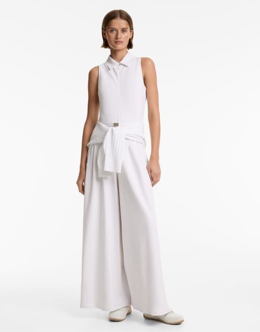OYSHO Polo collar long piqué jumpsuit with modal in white