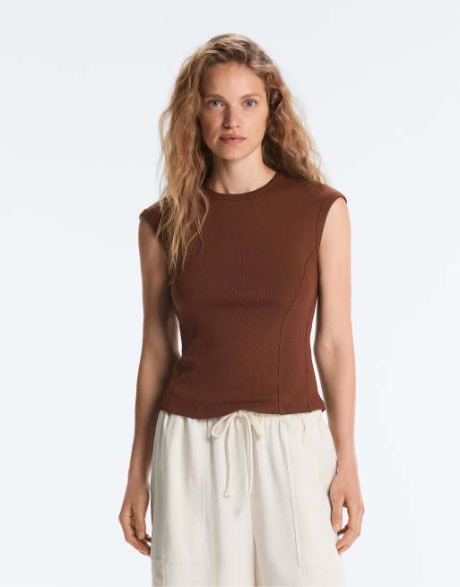OYSHO Short-sleeved rib top with cotton and modal in coffee