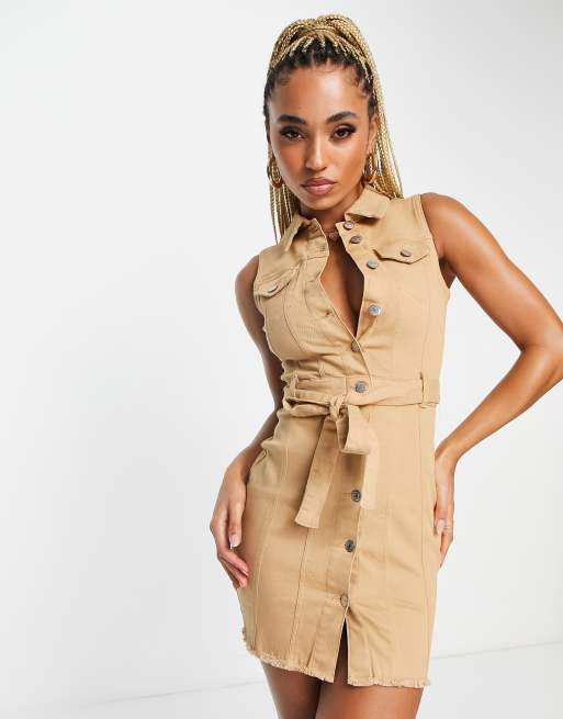 Parisian belted denim utility dress in camel