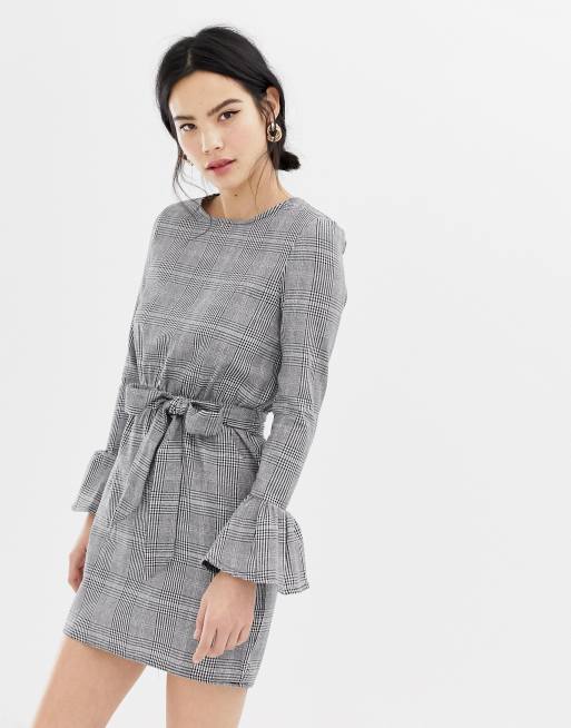 Parisian check dress with flare sleeve and tie waist