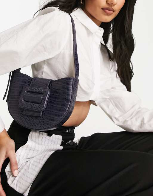 Paul Costelloe leather large buckle shoulder bag in navy blue croc