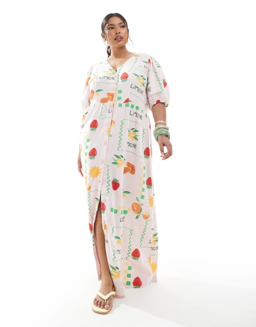 Pieces Curve puff sleeve button frontmaxi dress in pale pink based fruit print