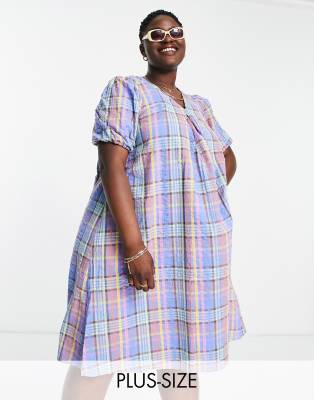 Pieces Curve puff sleeve midi dress in blue check