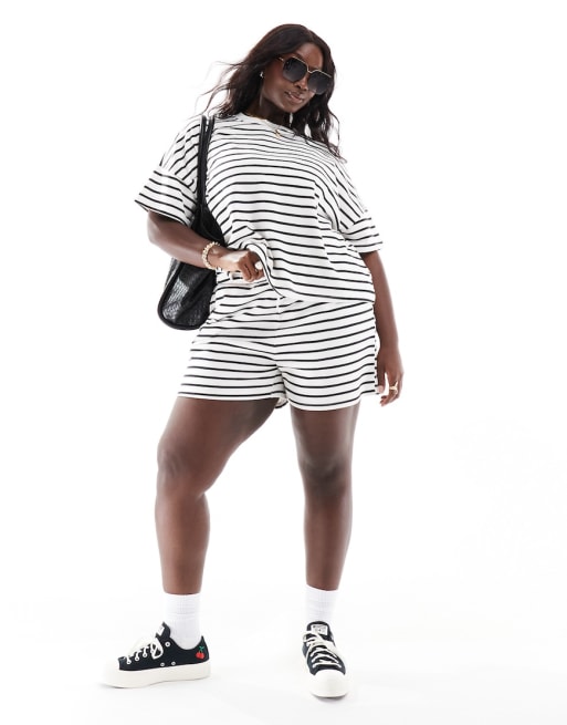 Pieces Curve sweat t-shirt and shorts co-ord in mono stripe