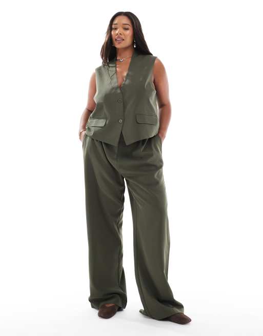 Pieces Curve tailored waistcoat and multiway button leg trouser set in khaki