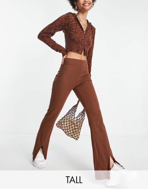 Pieces Tall split hem flared trousers in brown