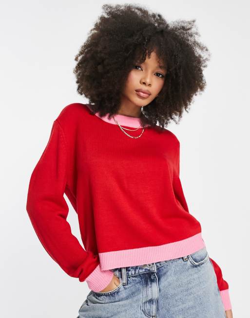 Pieces exclusive colourblock jumper in pink and red