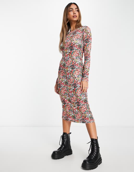 Pieces exclusive ribbed midi bodycon dress in ditsy floral
