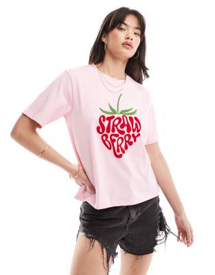 Pieces felt 'Strawberry' print oversized t-shirt in pink