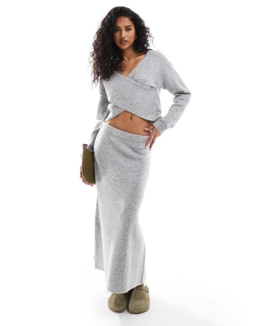 Pieces knitted wrap front jumper and maxi skirt set in light grey