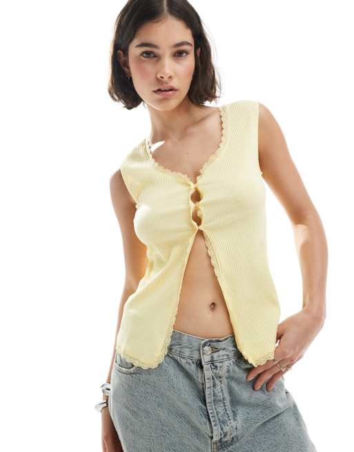 Pieces lace trim ribbed sleeveless top with button front detail in pale banana