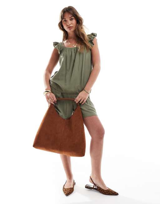 Pieces linen touch flutter sleeve cami top and shorts set in lichen green