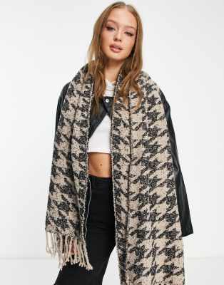 Pieces oversized super soft tassel scarf in brown houndstooth
