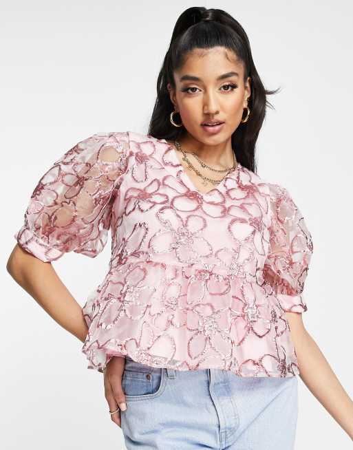 Pieces Premium embroidered floral puff sleeve peplum top in pink