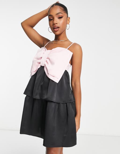 Pieces Premium oversized bow tiered mini dress in black & pink