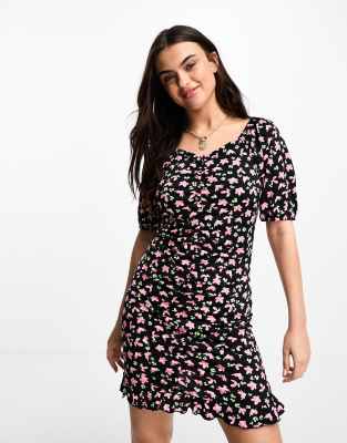 Pieces puff sleeve mini dress in black floral