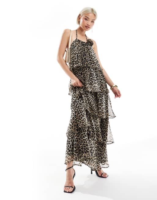 Pieces ruffle tiered maxi dress with corsage detail in leopard print
