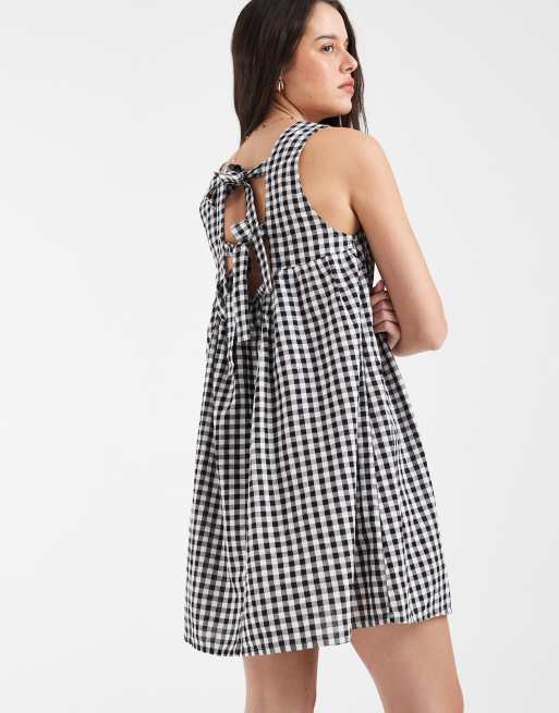 Pieces seersucker sleeveless tie back mini dress in black and white gingham print