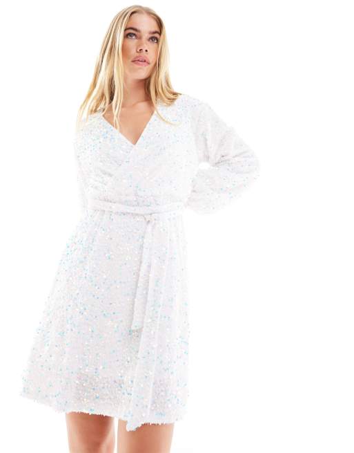 Pieces sequin belted wrap mini dress in white